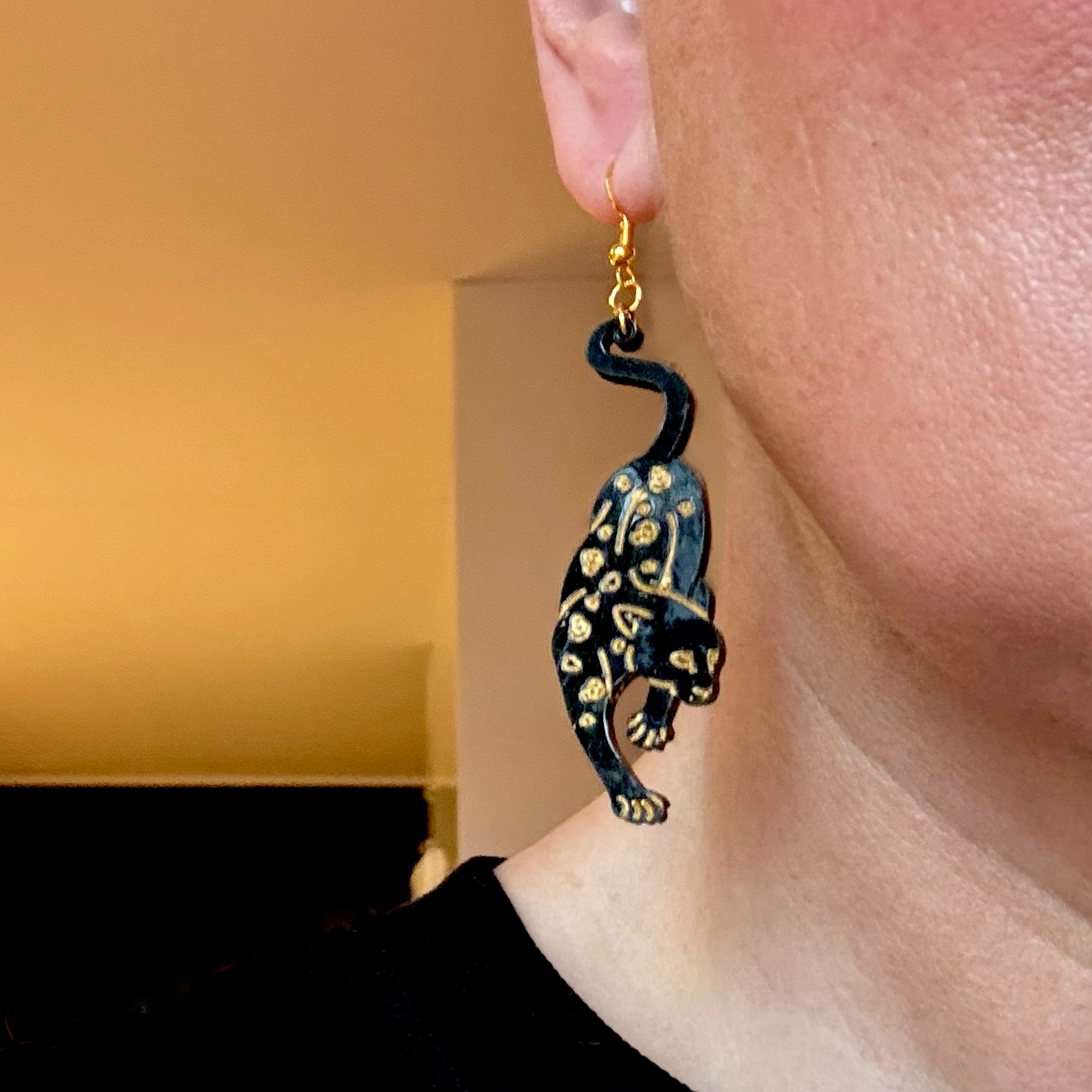 Handgjutna och handmålade svarta pantrar med guld. Nickelfria krokar.